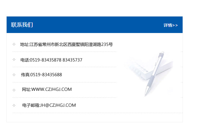 地址:常州市新北區友邦商務大廈1幢16、17層  電話:0519-85101652  傳真:0519-85112595  郵編:213022  網址:www_cz-jiayue_cn.hbzmyh.com  郵箱:xiajifengaa@163.com